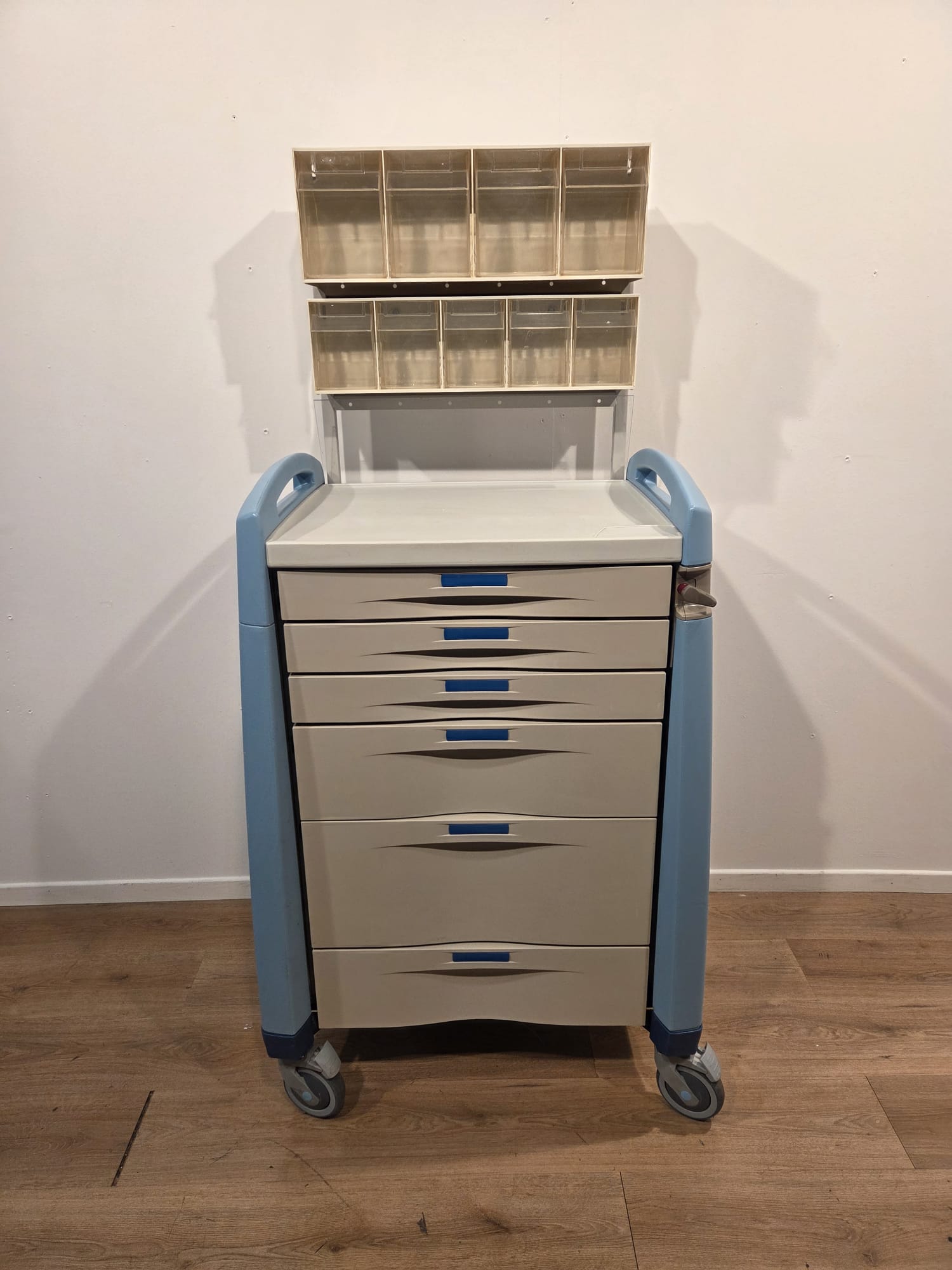The Capsa Avalo Medical Trolley is in excellent condition and designed for professional use in hospitals and clinics. Its durable and hygienic design ensures easy cleaning and long-lasting performance.